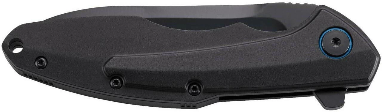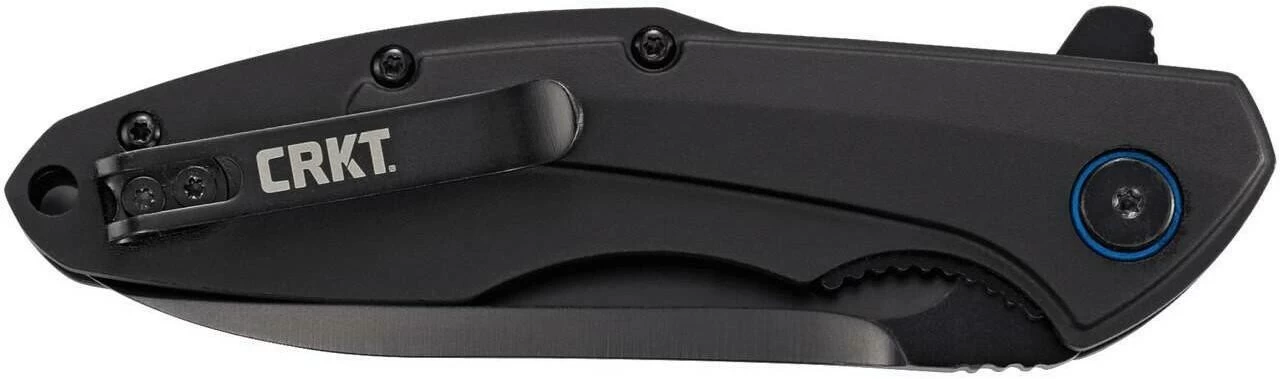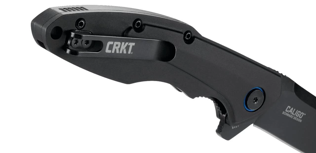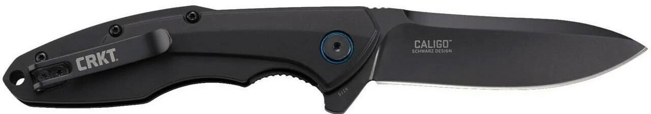 The CRKT Caligo Folding Pocket Knife features a low-profile flipper opening and IKBS ball-bearing pivot mechanism, that goes from zero to sixty faster than a hot rod. The Black oxide finish on the modified drop point blade couples nicely with the black anodized aluminum handles. The black oxide finish on the modified drop point blade is coupled with the black anodized aluminum handles, giving a fresh off the showroom floor look while the blue pivot ring elevates it to a league all its own.