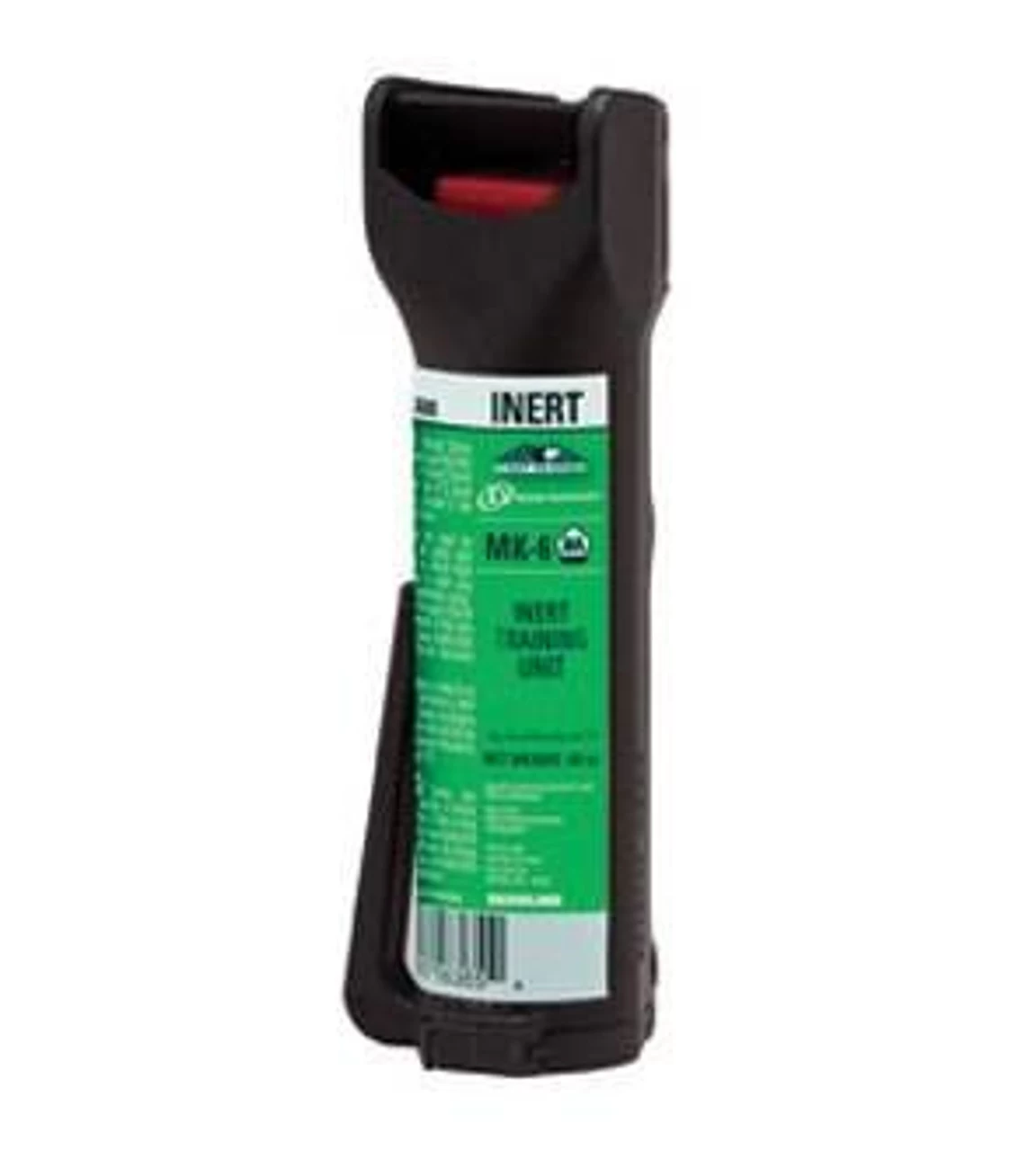 The Defense Technology Inert Training Unit MK-6 functions in duplicating the delivery system for aerosol sprays utilized for training purposes. The MK-6 will deliver 12-14 short bursts of OC at an effective range of 10-12 ft. This inert aerosol product utilizes a stream delivery method providing a target-specific, strong concentrated stream for greater standoff.