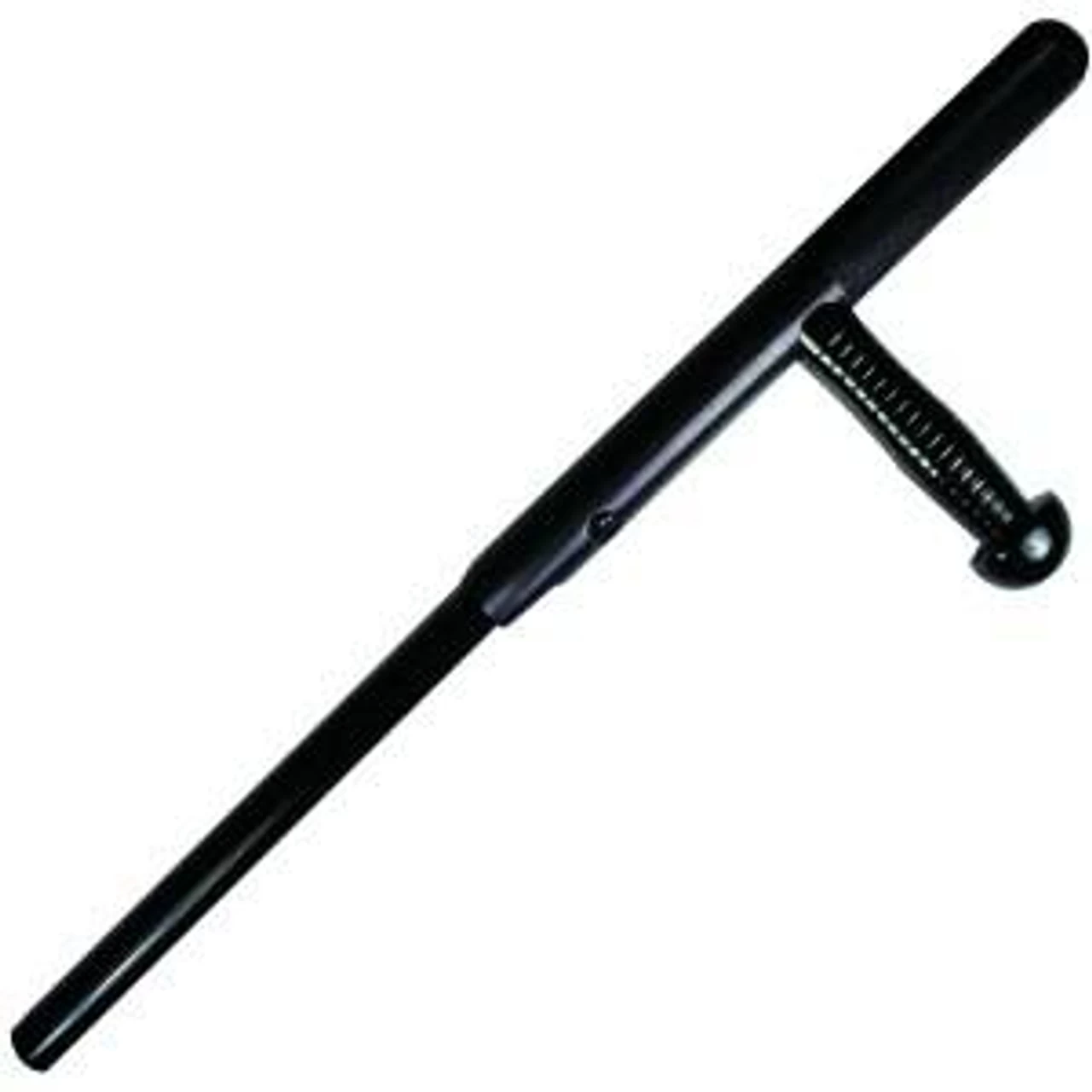 The Monadnock Expandable Polycarbonate PR24 with Stop Baton is a two-stage positive lock baton with a short handle fastened to an aluminum frame, which has a black anodized finish, with a knurled grip integrated into a 1-.5 inch (3.18 cm) diameter aluminum frame. An expanding polycarbonate shaft has a weight forward design to produce an enhanced follow through momentum.