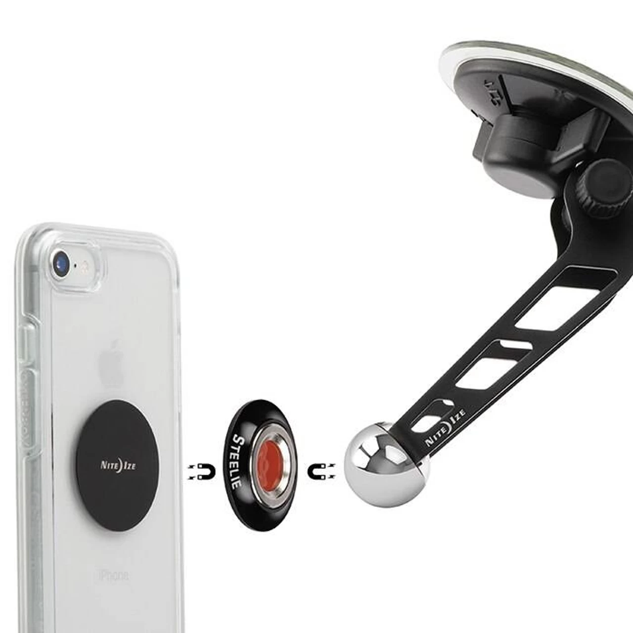 The Nite Ize Steelie Orbiter Windshield Kit combines the portable Windshield Mount with the powerful Orbiter Magnetic Socket to keep your phone secure and conveniently accessible. The Windshield Mount features an adjustable aluminum arm and suspended Steelie ball, which can be adjusted for the perfect viewing angle. The patented suction cup design features an easy-to-use locking lever for ultimate holding power to your windshield. It also acts as a quick release lever when you want to remove it, making it perfect for multiple cars or to take with you while traveling. The Orbiter Magnetic Socket attaches to the Windshield Mount using a powerful neodymium magnet and silicone center for a secure connection and smooth glide. By combining magnetic power and a thin high-friction ring designed to prevent slipping, the phone docking surface of the Orbiter Magnetic Socket holds your phone securely in place. Simply adhere the low-profile metal plate to your phone or case and you’re ready to quickly attach, detach, and rotate your phone for quick and easy handsfree viewing wherever you go.
