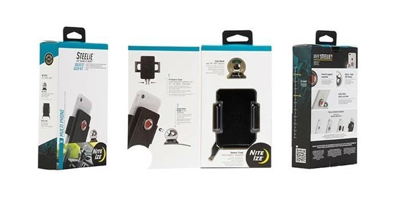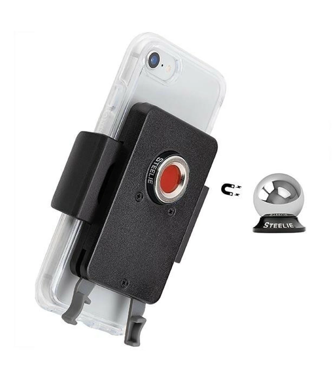 The Nite Ize Steelie Squeeze Dash Kit allows you to dock your phone for the long haul and navigate hands-free. The Steelie Squeeze Dash Kit pairs the modern Squeeze Clamp with the classic Steelie Dash Mount for simple attachment, smooth 360° rotation, and a strong hold. Virtually any phone with a case and accessories is secured between the grippy Squeeze arms and magnetically attached to the Dash Mount for adjustable viewing. To secure your phone for the drive ahead, easily pinch the levers to open the Squeeze arms, place your phone, and release the levers to secure – no extra grip strength needed. The steel ball of the Dash Mount allows the Squeeze Clamp to smoothly rotate for endless viewing angles, and easily attaches to your dash with included 3M VHB foam adhesive. As an added bonus, when the Squeeze Clamp is on your phone, it can magnetically connect to other Steelie mounts and magnetic surfaces such as your refrigerator, car, or toolbox for hands-free viewing. In addition to allowing for endless interchanging between multiple phones and cases, Squeeze is also compatible with MagSafe phones, cases and wireless chargers.