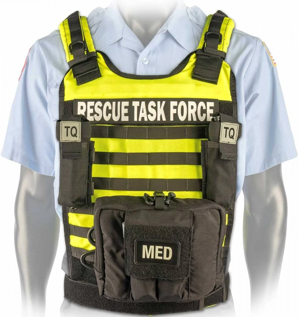 Developed for rescue personnel working in the Direct and Indirect Threat areas of AS/MCI’s, the Rescue Task Force Vest Kit provides rescuers with a personal protective ballistic vest combined with the essential medical equipment to provide immediate point-of-wounding care to injured casualties.