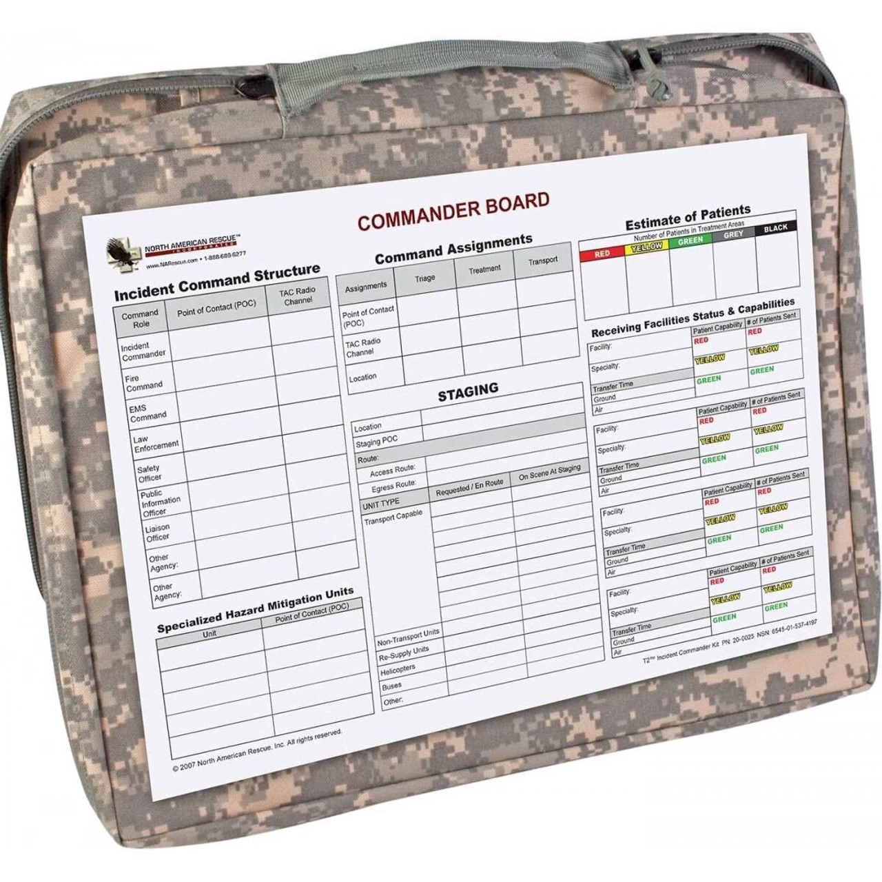 The North American Rescue T2 Command Kit enables the user to establish an organized disaster-response system quickly and efficiently. The kit includes items such as a laminated and detachable T2 Commander, T2 Incident-Response, and T2 Blast/WMD Scene-Command Boards for organizing and tracking groups of casualties, plus a pad of 50 T2 Patient Tracking Boards for documenting individual patients. The self-contained kit also has 2 bar-code storage sheets, 3 clear storage pouches, and 2 black grease pencils.