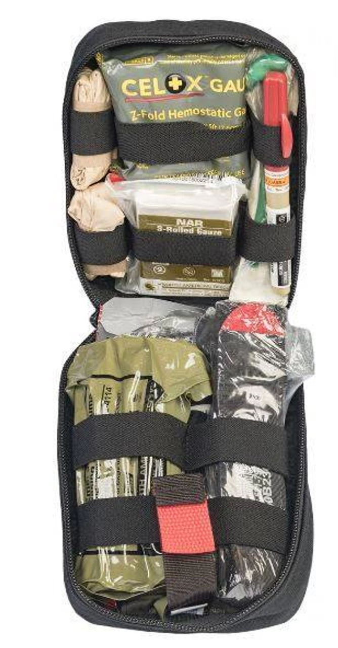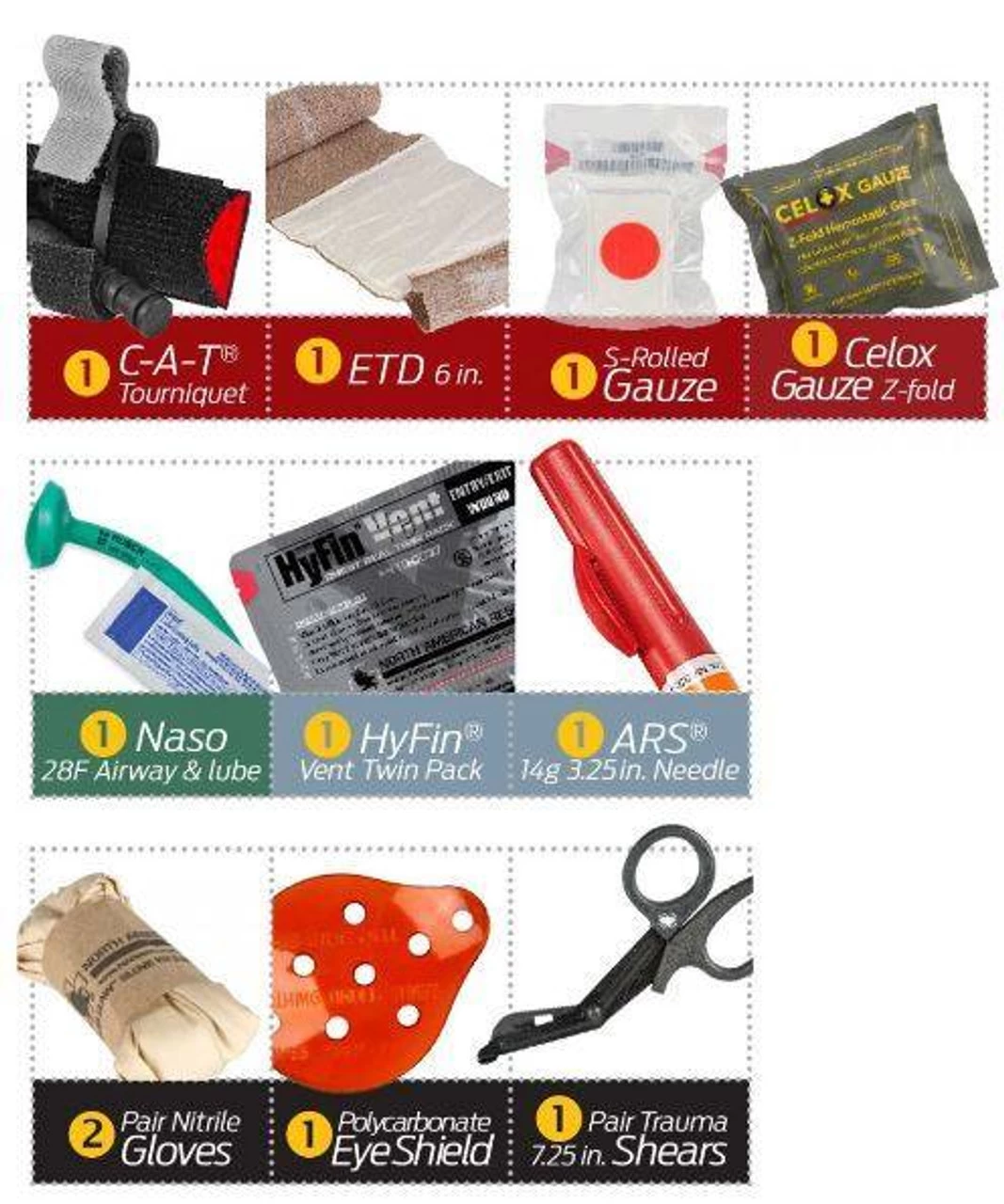 - Compact individual first aid kit providing critical support for immediate Self-Aid, Buddy-Aid at the point of wounding