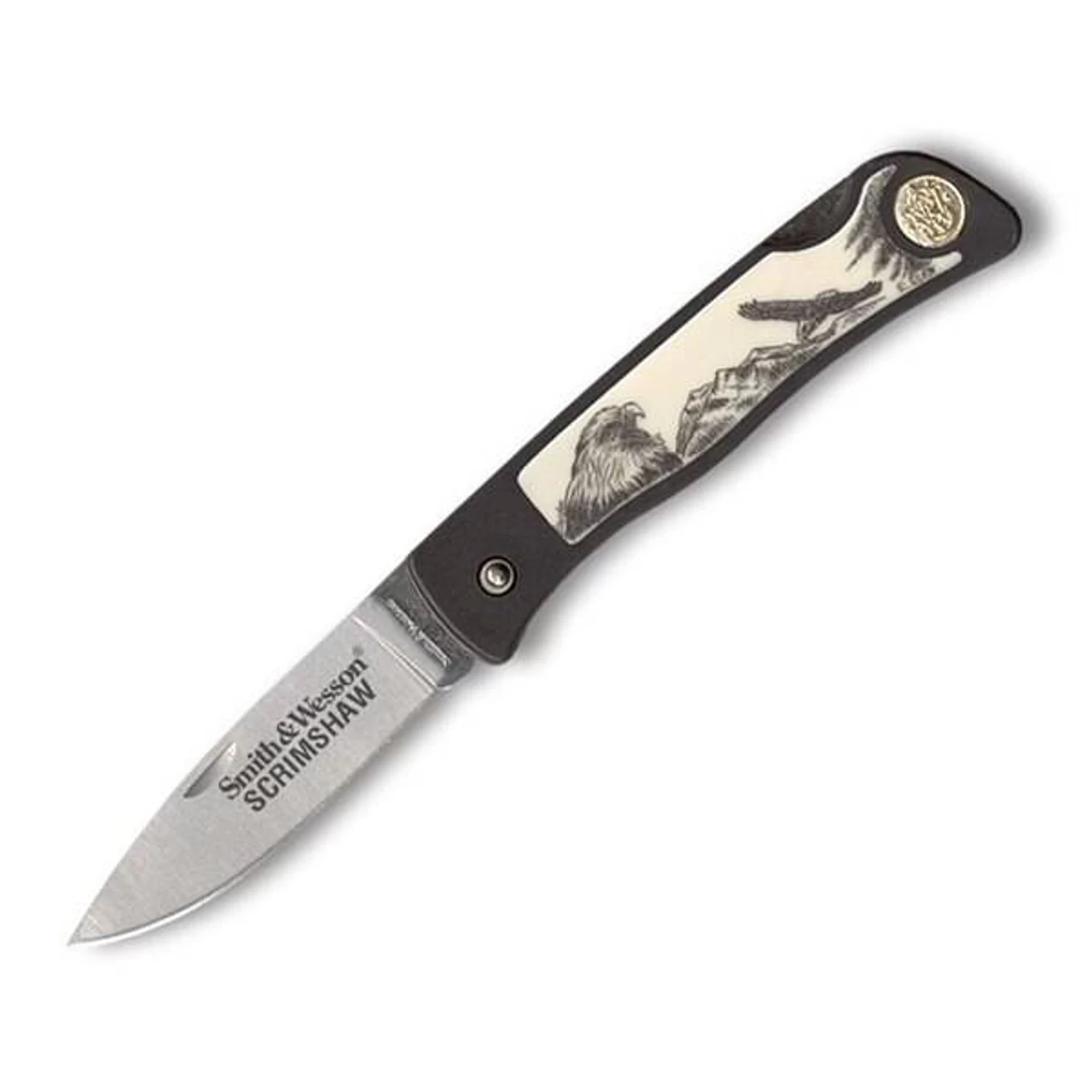 Smith and Wesson Eagle Scrimshaw Knife features a 2.44″ drop point blade made of 440C stainless steel. The blade of this Smith and Wesson Knife has a nail nick opening and Smith and Wesson etch. The black Zytel handle of this Smith and Wesson Knife, 3.52″ closed, has an imitation ivory eagle scrimshaw inlay, a gold tone S&W shield, and a lockback. The Smith and Wesson Eagle Scrimshaw Knife weighs 1.70 ounces.