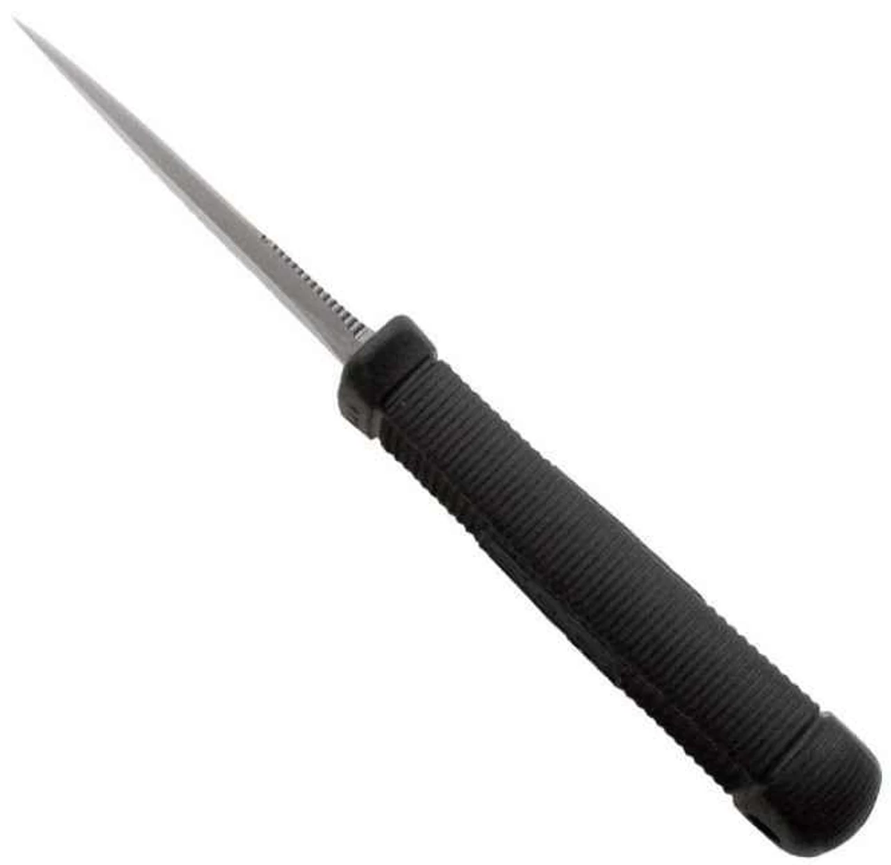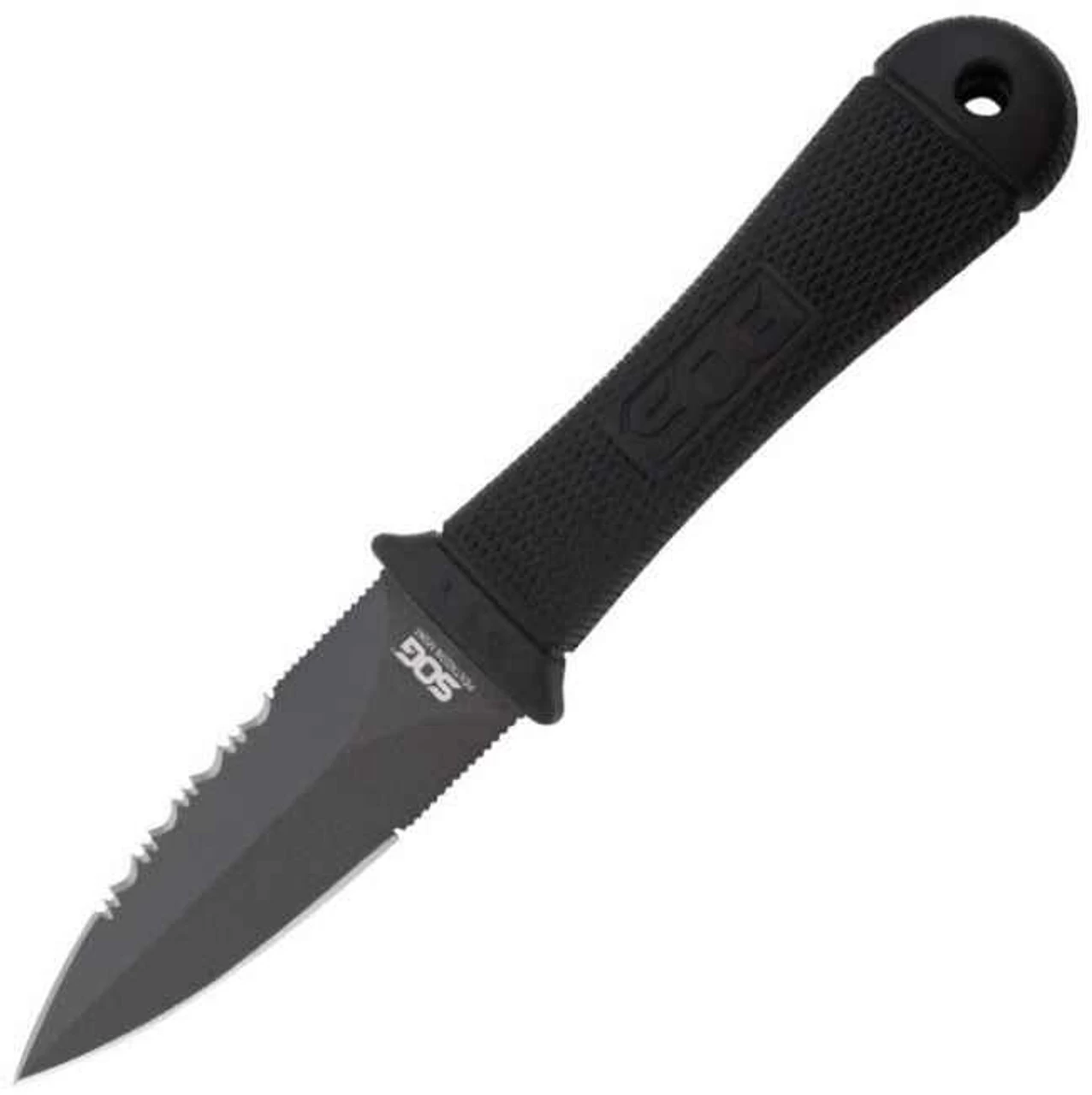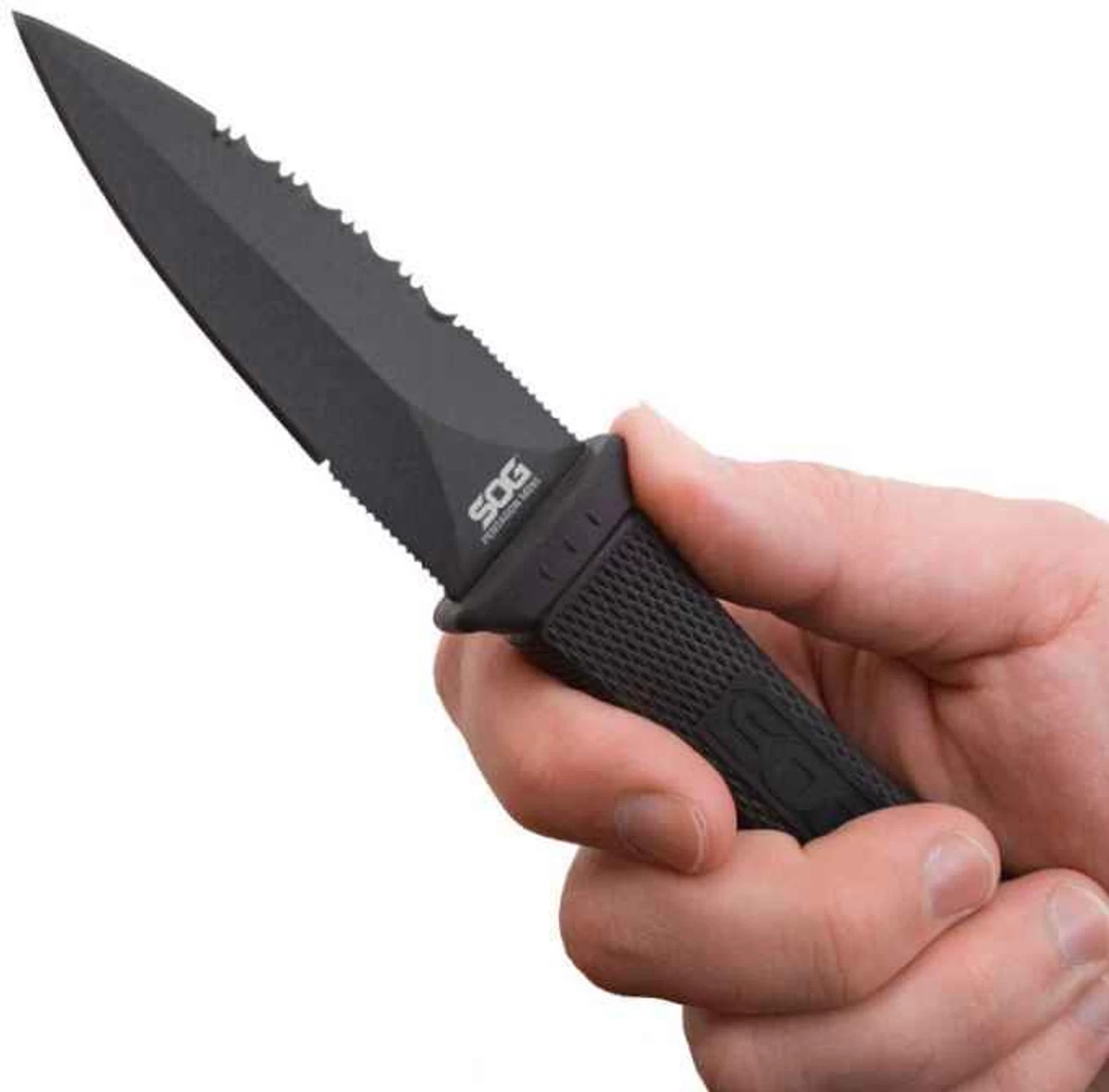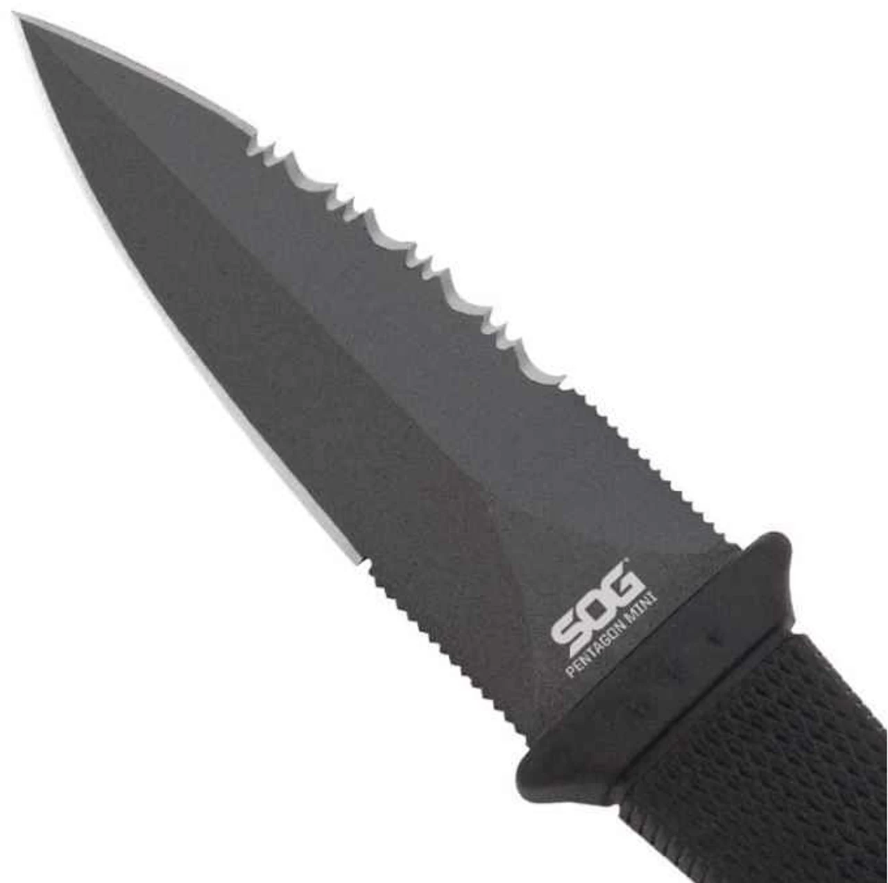 The SOG Mini Pentagon knife is the compact version of the original SOG Pentagon, the Mini Pentagon is a serious back-up knife that easily conceals in boot or vest. Extremely lightweight and comfortable to maneuver, the Mini Pentagon also offers the instant choice between a straight or serrated edge for multiple cutting tasks. Twin thumb notches on the blade enable accurate blade orientation and downward control. Like its big brother, the Mini Pentagon has aggressively checkered, flared Kraton handles for confident gripping as well as sensational feel and balance.