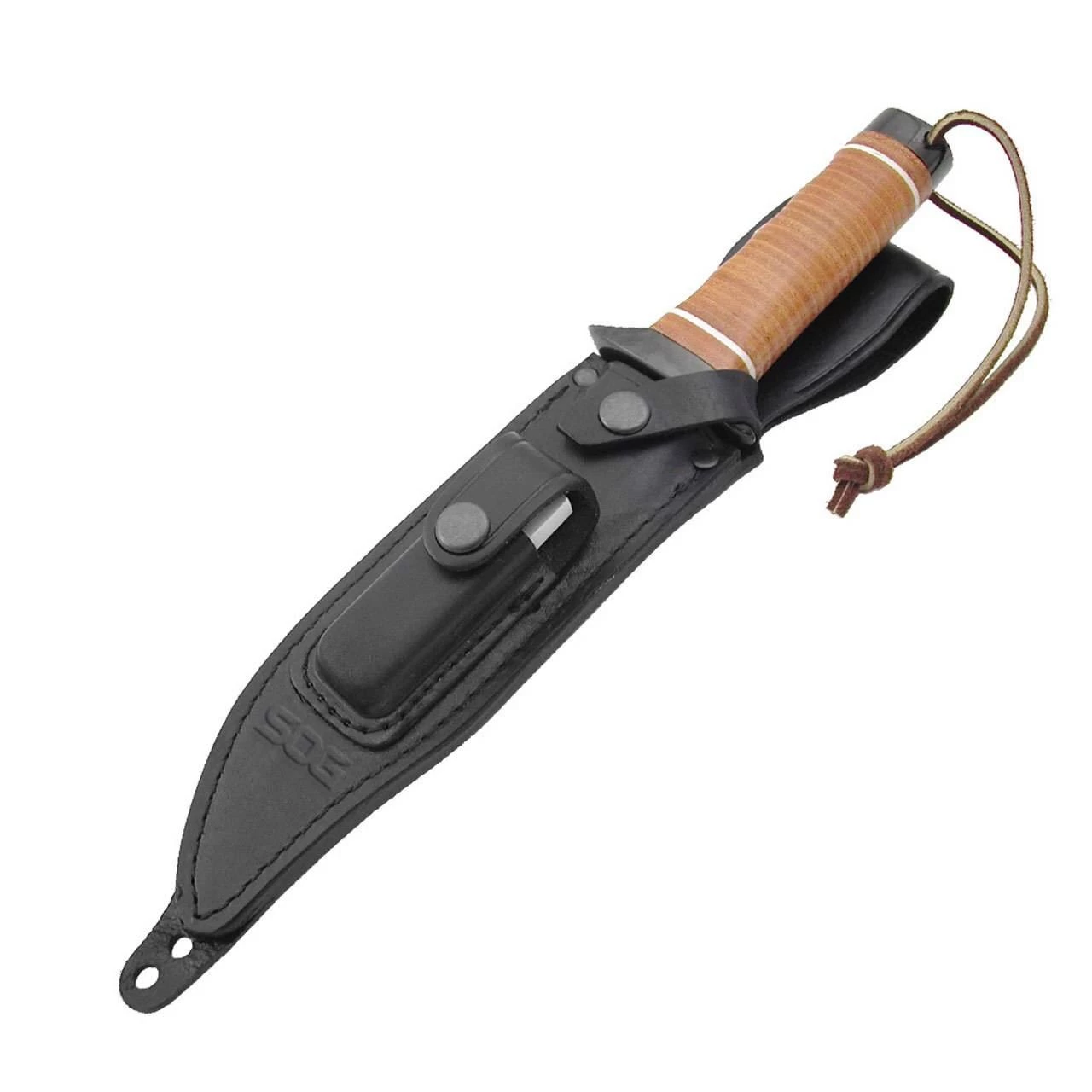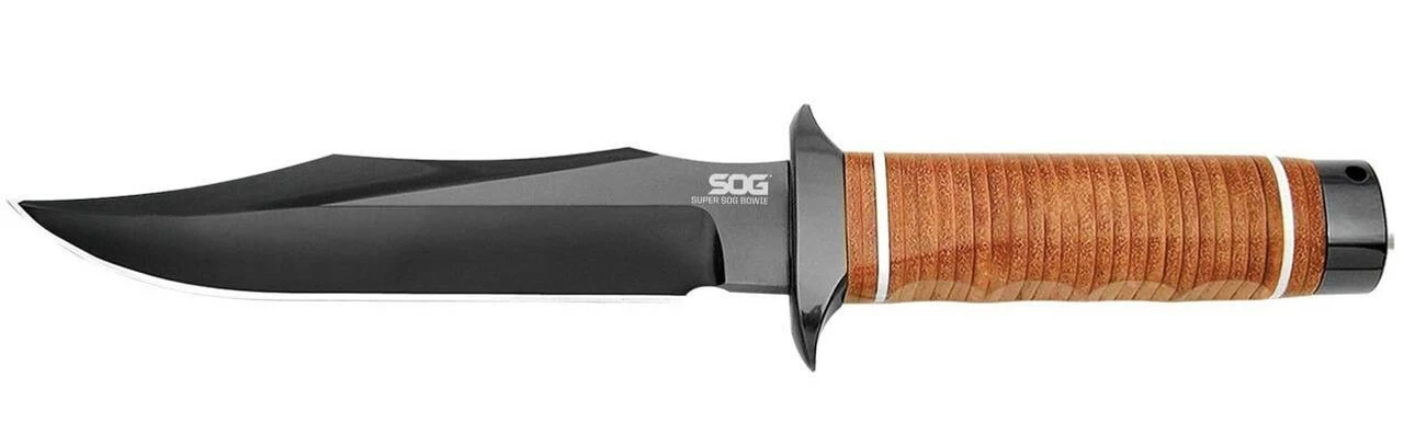 The Super SOG Bowie is a new adaptation of the original SOG Bowie that founded the company. This large format 7.5″ AUS-8 steel blade will stun you with its precise construction and grind lines. Unlike the original, all parts are protected with hardcased black TiNi coating for best appearance and performance. The sculpted cross guard keeps your fingers safe and sound. It retains its classic look with stacked leather washer handle and overall design.