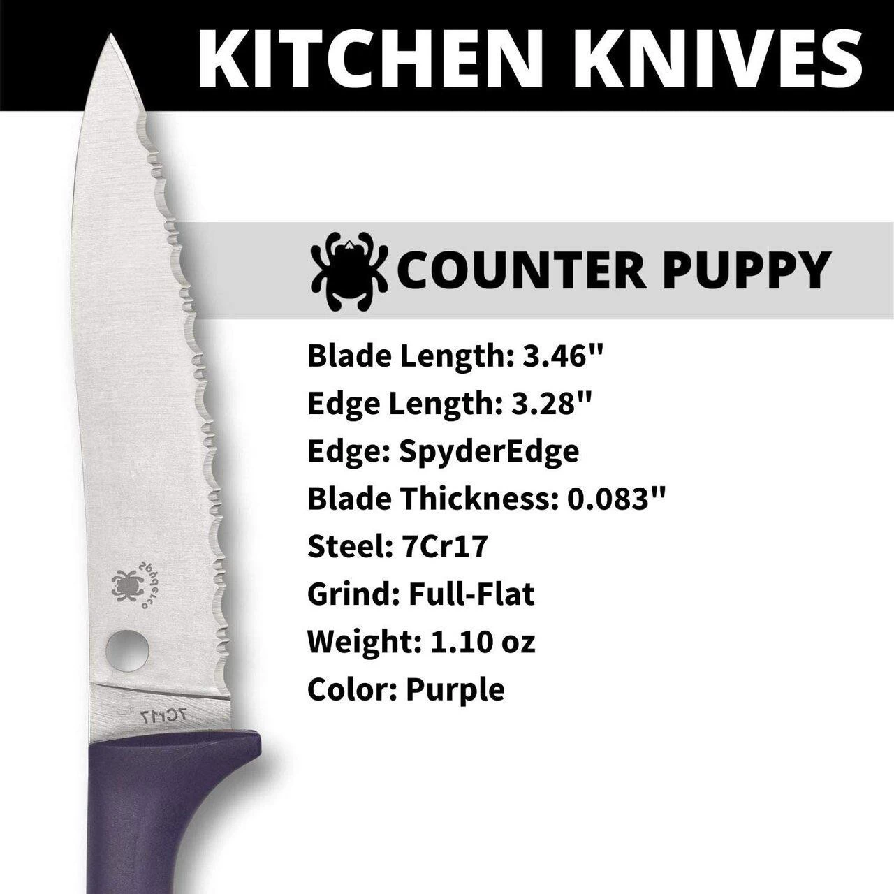 The Counter Puppy Fixed Blade SpyderEdge Knife features an injection-molded high-impact plastic handle that is shaped like the stylized body and legs of a puppy. The design of this new concept in kitchen cutlery allows this knife to stand upright on a counter or tabletop, keeping it clean and handy while creating a truly distinctive table setting presentation.