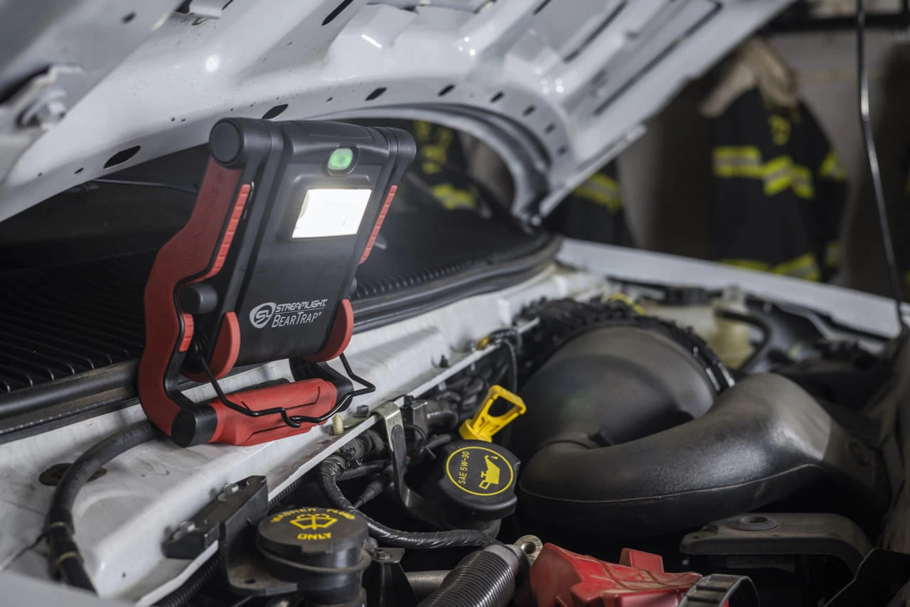 The Streamlight BearTrap Worklight produces bright, white light in both flood and spot modes to help you inspect, identify, and repair in your garage or workspace. The BearTrap can clamp virtually anywhere, stand on its own, has a magnetic base, and a stowable hook allowing you to light up hard-to-reach spaces like under your dash or illuminate your whole garage. The rubberized grip surface is designed to prevent scratches to your light and equipment.