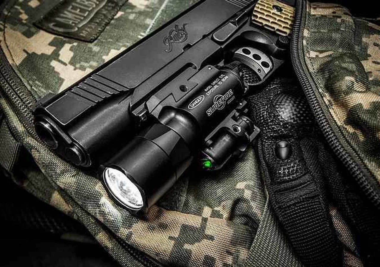 The SureFire X400 Ultra Tactical WeaponLight with Green Laser features a recoil-proof LED and TIR lens that focuses 1,000 lumens of light into a smooth, far-reaching beam with a large central spot that is extremely effective for close- to medium-range engagements. The laser’s aiming adjustment mechanism uses Nylok screws that won’t back out from the effects of recoil, which means it rarely needs to be re-zeroed. The high-strength aerospace aluminum body is Mil-Spec hard anodized for superior toughness and corrosion resistance and is O-ring and gasket sealed to keep out dust and moisture. The X400 Ultra’s 5-milliwatt laser sight, located below the primary light, emits a high-visibility red (635 nM) beam. The versatile X400 Ultra can be attached to a pistol or a long gun since its Rail-Lock system permits rapid attachment/detachment from either Universal or Picatinny rails. Its integral ambidextrous push/toggle switch provides one-finger operation for either momentary or constant-on operation.