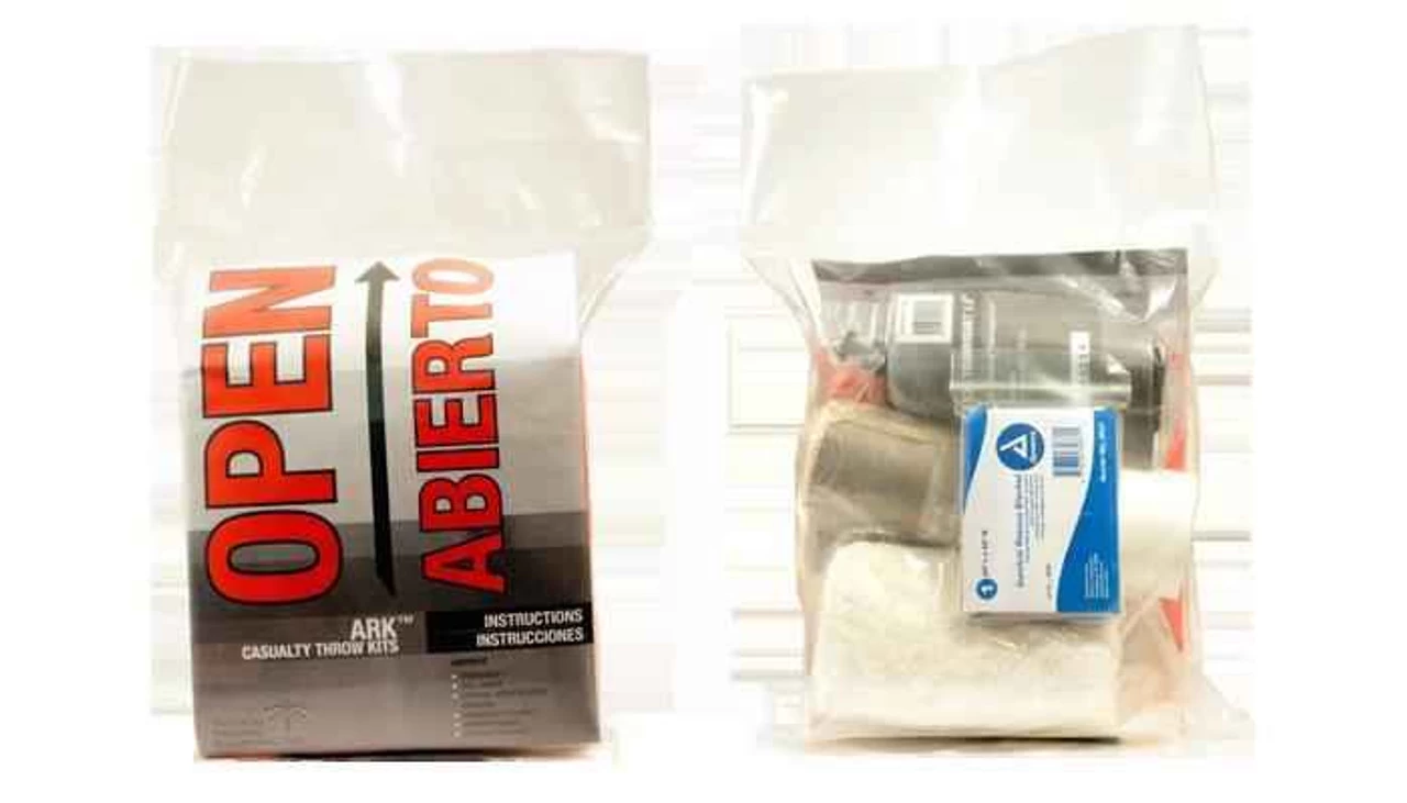The Tactical Medical Solutions TACMED ARK Casualty Throw Kit contains basic treatment material and bi-lingual instructions for providing initial treatment. By controlling life threatening hemorrhage and positioning the casualty in a manner that maintains the airway, significant time can be gained in the rescue effort.