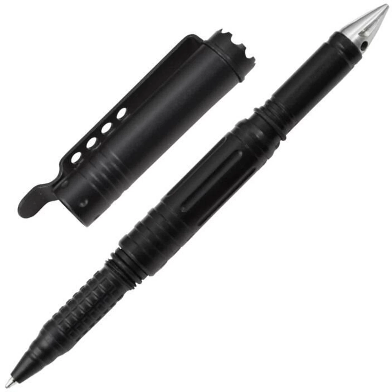 The UZI Tactical Pen is a an everyday carry writing and defense tool with a glass breaker crown bezel and a pocket clip. This model has a black aluminum body. The UZI pen writes well, and uses standard and Fisher Space Pen refills.